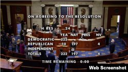 Amalunga edale leli angamakhulu amabili lamatshumi amathathu lambili – 232 avotele ukuba uTrump asuswe esikhundleni kwathi abafika phose amakhulu amabili – 197 bavotela ukuba aqhubekele phambili ngomsebenzi kamongameli.